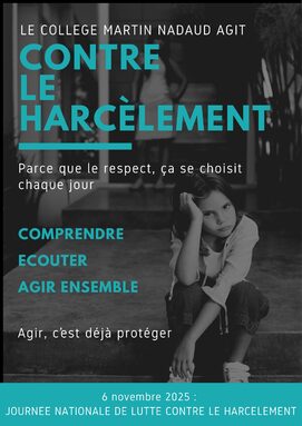 Par admin martinnadaud, publié le jeudi 6 novembre 2025 15:39 - Mis à jour le vendredi 7 novembre 2025 16:37À l’occasion de la Journée nationale de lutte contre le harcèlement scolaire, le collège Martin Nadaud a organisé, le jeudi 6 novembre 2025, une matinée de sensibilisation et de prévention à destination de l’ensemble des élèves. -
